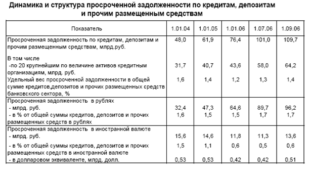 В таблице 1 приведены данные Банка России по динамике и структуре просроченной задолженности по кредитам, депозитам и прочим размещенным средствам [2].