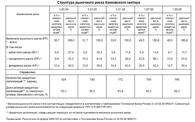 Очевидно, что доля рыночного риска в проценте к совокупному капиталу кредитных организаций увеличилась в 2006 году по сравнению с предыдущими отчетными периодами. Также можно говорить об увеличении удельного веса процентного риска в рыночном риске.