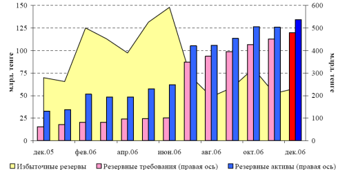 В результате изменения механизма формирования и выполнения минимальных резервных требований в 4 квартале 2006 года избыточная ликвидность банков второго уровня оставалась на относительно стабильном уровне. В среднем за данный период резервные активы на 17% превышали необходимый объем резервирования (в 3 квартале 2006 года – на 15%), как показано на рисунке 2.