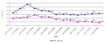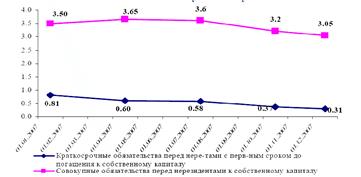 На рисунке 4 можно заметить цикличность изменения коэффициента краткосрочной ликвидности. Например, с июля 2006 года также наблюдалось незначительное снижение данного коэффициента. Таким образом, процесс снижения доли ликвидных активов в совокупных активах банковской системы с начала текущего года (динамика значений с января по август 2007 года) наметился еще до возникновения проблем на внешних рынках.