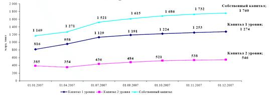 На рисунке 6 отображено, что в 2007 году собственный капитал банков второго уровня увеличился на 50,6% или на 591 млрд.тенге и составил на 01.12.2007 года 1 760 млрд. тенге. При этом за рассматриваемый период капитал первого уровня увеличился на 56,1% или до 1 274 млрд. тенге, капитал второго уровня – на 41,8% или до 546 млрд.тенге.