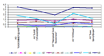 Согласно рисунку 7 выполнение пруденциальных нормативов крупнейшими банками второго уровня в части коэффициентов k1, k2, k3, k3`, k6 близки по значению, поэтому на диаграмме они сливаются в одну линию. Диаграмма, приведённая на рисунке 7, наглядно отображает значения коэффициентов k4, k7, k8, k9 по анализируемым банкам, причём значения этих коэффициентов АО "Народного Банка Казахстана" по сравнению с другими банками являются наименьшими.