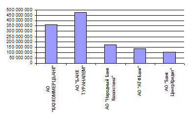 Из рисунка 8 видно, что АО "Банк ТуранАлем" обладает наибольшим собственным капиталом, на втором месте по размеру собственного капитала стоит АО "Казкоммерцбанк", АО "Народный Банк Казахстана" соответственно на третьем месте.