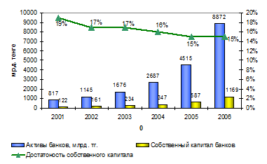 Как показано на рисунке 9, активы банков за 2006 год выросли почти в два раза. Однако, достаточность капитала, несмотря на снижение, остается стабильной на уровне 15%. Минимальный установленный Агентством уровень – 12%, Базельские рекомендации –8%.
