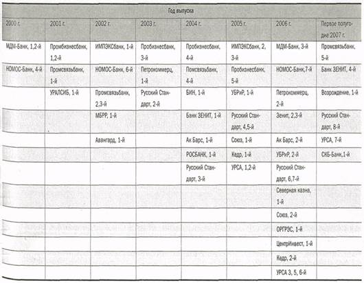 Таблица 6.1. - Банки с присвоенным кредитным рейтингом RUSRATING, выпускавшие облигации в 2000 - 2007 гг.