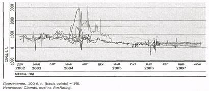 На рис. 2 представлена динамика кредитных спрэдов облигаций банков, которым присвоен кредитный рейтинг RusRating. Как видно на графике, с начала 2006г. не только снизились спрэды, но и их волатильность стала меньше. Расширение и развитие российского фондового рынка, выход на него новых игроков, формирование кредитных историй эмитентов, положительная динамика рос та всего фондового рынка и другие факторы оказывают влияние на снижение стоимости заимствований для эмитентов, хотя на рынок выходят новые эмитенты, ставки размещения и кредитный спрэд которых может быть несколько выше. Эти факторы и растущий интерес инвесторов к долгам российских банков способствуют увеличению объема торгов банковскими облигациями и ликвидности этого рынка. Таким образом, представленный спрэд все меньше подвергается влиянию других факторов, а больше отражает именно риски каждой конкретной облигации.