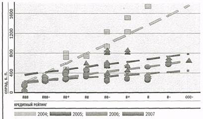 Рис. 4. Кредитный спрэд для каждого уровня рейтинга RusRating в 2004 - 2007 гг.