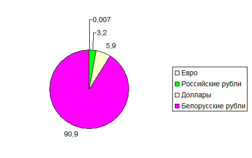 Рисунок 2.1 показывает, что наибольшую долю в привлеченных средствах составляют белорусские рубли - 90,9%, доля долларов США составляет 5,9%, российских рублей – 3,2%, Евро 0,007%.