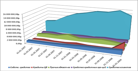Привлеченные средства, в свою очередь, - это депозиты - денежные средства, внесенные в банк клиентами (физическими и юридическими лицами), средства кредитных организаций (межбанковские кредиты), прочие обязательства и кредиты ЦБР. Для наглядности, по данным таблицы 1 построим диаграмму, показывающую структуру ресурсов ОАО "Дальневосточный банк" за два года.