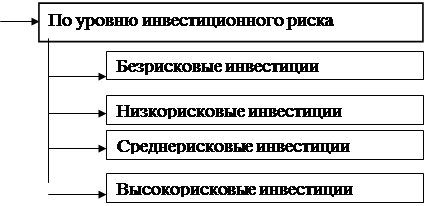 Безрисковые инвестиции. Они характеризуют вложения средств в такие объекты инвестирования, по которым отсутствует реальный риск потери капитала или ожидаемого дохода практически гарантированно получение реальной расчетной суммы инвестиционной прибыли.