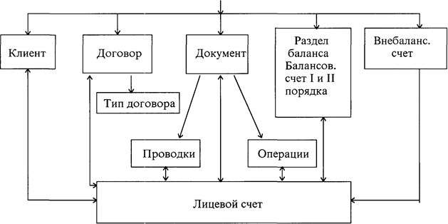 Объекты системы изображены прямоугольниками, а стрелками связи между объектами и обозначают возможность обращения от одного объекта к другому. Например, двусторонняя стрелка Клиент-Лицевой счет обозначает, что, работая с объектом "Клиент", мы имеем возможность обращаться к массиву лицевых счетов, связанных с данным объектом, и наоборот, работая с планом счетов, по номеру лицевого счета мы можем получить информацию о связанном с ним клиенте, если таковой имеется. Указанная схема организации данных позволяет комплексно подойти к проблеме информационного обеспечения работы банка, что означает непосредственное сопряжение в работе различных подразделений банка в режиме реального времени.