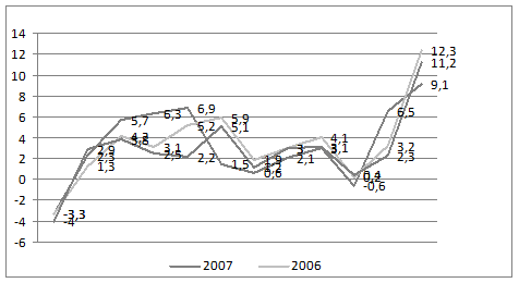 Рис.3 Темпы прироста денежного агрегата М2 (месяц к предыдущему месяцу, %)