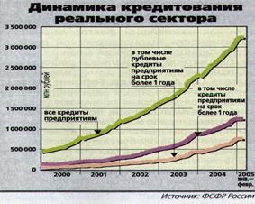 Отслеживая уровень кредитования в России можно сделать вывод об активности роста экономики. На графике 1.2.1. [7] видно, что в период с 2000 г. по 2005 г. Происходит стабильный рост уровня кредитования, следовательно растет деловая активность членов рынка, доверие к кредитным институтам.