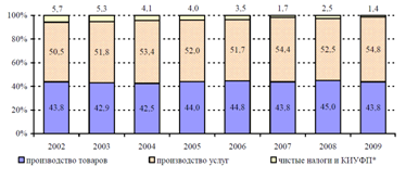 В структуре ВВП по прежнему большая часть приходится на услуги (54,8%), при этом с 2002 года их доля устойчиво превышает половину объема ВВП (рис.2.7.)