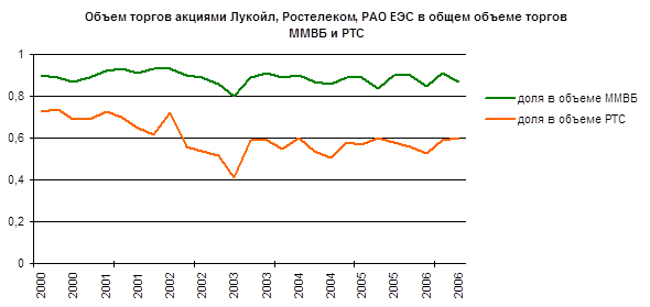 Так, колебание торгов на ММВБ на 99% определяется колебаниями объемов торгов акциями Лукойла, РАО ЕЭС, Сургутнефтегаза и Ростелекома. На РТС ведущую роль играют снова Лукойл, РАО ЕЭС, Норильский никель и Ростелеком, чей общий вклад составляет 97% колебаний объемов торгов системы[22]. Если учесть, что акции Газпрома в основном котируются на МФБ, то оказывается, что всего четыре компании в России доминируют на рынке. Можно отметить (рис. 3) более высокую концентрацию трех ведущих акций в объеме торгов на ММВБ, чем у РТС. На ММВБ высока концентрация торговли акциями РАО ЕЭС – 62.5% против 24.8% на РТС.
