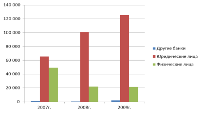 Приведенные в таблице 3 данные показывают, что услуги по кредитованию других банков увеличились в 2009 году и составили 28,79% и 20,49% от суммы услуг, оказанных в 2007 и 2008 годах соответственно. Также в 2009 году снизились услуги по кредитованию физических лиц, которые составили 56,34% и 3,36% от уровня 2007 и 2008 годов. Услуги по кредитованию юридических лиц увеличились в 2009 году на 91,86% и 24,45 по сравнению с 2007 и 2008 годом соответственно. Динамика услуг, предоставленных АО "Евразийский банк" по кредитованию за 2007-2009 годы графически показана на рисунке 3.