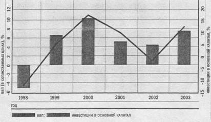 Позитивная макроэкономическая ситуация уже привела к увеличению инвестиций и экономическому росту. При этом следует особо отметить, что в последние годы в России темпы экономического роста тесно коррелируют с инвестиционной активностью. Наибольший экономический рост (в 2000 и 2003 гг.) приходился на максимумы увеличения инвестиций в основной капитал (рис. 1).