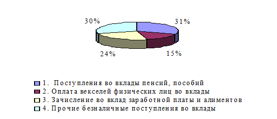 Рассматривая полученные данные, можно сказать, что большую долю в объеме поступлений занимают поступления во вклады пенсий и пособий, составляя 31,4%, а также прочих безналичных перечислений (30,3%). Сравнительные показатели можно проанализировать на диаграмме.