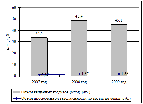 Анализ данных таблицы 2.3 и рис. 2.4 позволяет сделать вывод о соотношении предоставленных кредитов и просроченной задолженности по ним. Так, с 2007 по 2008 гг. увеличивался объем кредитов, и вместе с тем росла задолженность физических лиц. С 2008 по 2009 гг. падают кредиты гражданам – клиентам банка, но несмотря на это задолженность продолжает расти.