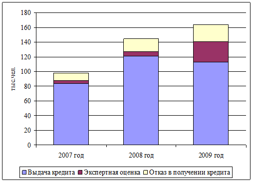 Так, в течение трех лет число желающих получить кредит возрастало. Однако в 2007 году получить положительное кредитное решение органов «Газпромбанка» удалось 85% заемщиков, в 2008 году – 83% из числа желающих. Несмотря на то что в 2009 году количество заявок на получение кредита превысило данный показатель 2008 года, объем выданных кредитов все же снизился на 6,8%.