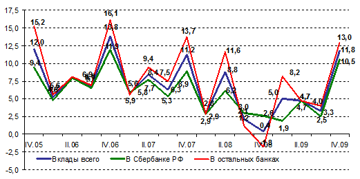 Поквартальная динамика в течение года показывала постепенное снижение темпов прироста вкладов с 5% в I квартале, до 4,7% во II-м и 3,3% в III квартале. Однако качество этих приростов было различным. Так, увеличение суммы вкладов в I квартале 2009 г. главным образом определялось валютной переоценкой вследствие снижения курса рубля, а во II квартале, напротив, наблюдался чистый приток средств населения в банковскую систему в условиях укрепления рубля.