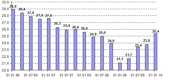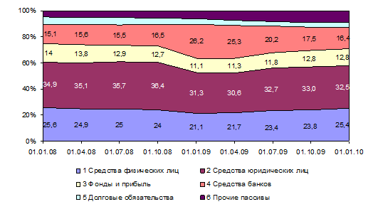 По состоянию на 1 января 2010 г. на долю вкладов населения приходится 25,4% пассивов банковской системы, на средства юридических лиц - 32,5%.