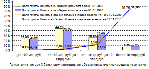 В целом на протяжении 2009 г. продолжился процесс концентрации вкладов в крупных и средних банках. Также можно отметить, что вслед за ростом объема вкладов происходит рост численности банков в группах с большим объемом вкладов. С 1 января 2009 г. по 1 января 2010 г. число банков, привлекших свыше 10 млрд. руб. средств населения, выросло с 53 до 66, а количество банков с объемом вкладов от 1 до 10 млрд. руб. - с 236 до 263 банков. Число банков с объемом вкладов до 1 млрд. руб., напротив, снизилось.