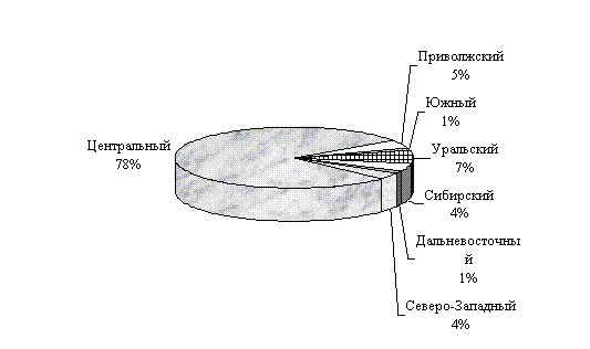 На диаграмме 3 представлена доля страховых взносов по федеральным округам в 2001 г.