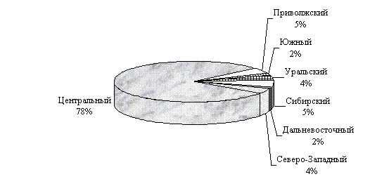 На диаграмме 4 представлена доля страховых выплат по федеральным округам в 2001 г.