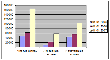 Сумма работающих активов стабильно растет. Так, на 01.01.2005г. их объем равен 44062 тыс. руб., на 01.01.2006г. темп роста составил 125,3%, а 01.01.2007г. – 188,4%.
