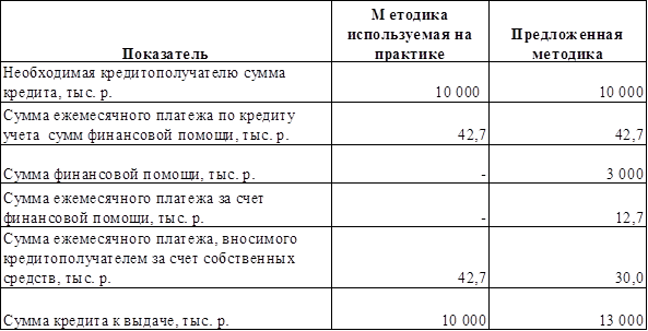 В предлагаемой методике учтено поступление финансовой помощи кредитополучателю для погашения льготного кредита, что позволяет более точно проанализировать его кредитоспособность. Как показывает расчет, в этом случае в отличие от действующей практики увеличивается максимальный размер кредита к выдаче кредитополучателю, что в свою очередь позволяет строить квартиры большей площади.