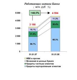 Ключевым фактором роста бизнеса Банка является развитие операций кредитования – на долю кредитов корпоративным и частным клиентам в работающих активах приходится в совокупности около 87%. Вложения в ценные бумаги осуществляются Банком в основном в целях поддержания необходимого уровня ликвидности. По состоянию на 1 января 2008 года вложения в ценные бумаги составляют лишь немногим более 11% работающих активов, что снижает зависимость финансовых результатов Банка от изменения цен на фондовых рынках.