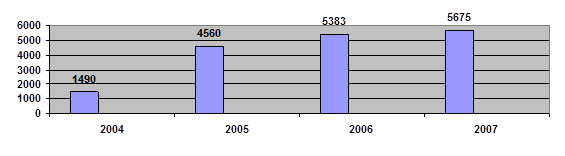 В связи с этим возросли эксплуатационные расходы: за IV квартал 2004 г. они составили 1672 тыс. руб., а за 1 квартал 2005 г. - 3046 тыс. руб. (в 1,82 раза). Если в 2004 г. расходы по такой статье в квартал в среднем составляли 1490 тыс. руб., то в 2005 г. - уже 4560 тыс. руб., в 2006 г. – 5 383 тыс. руб., а в 2007 г. – 5675 тыс. руб. (рисунок 2.5.). Подобное увеличение статьи эксплуатационных расходов за 2006-2007 гг., связано с переездом банка в новое здание, где были созданы современные условия для обслуживания клиентов.