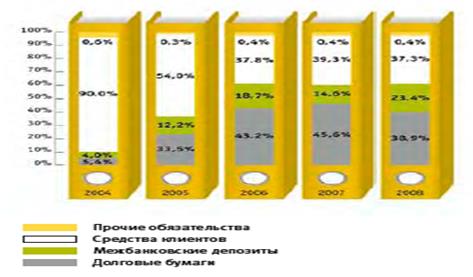 В структуре обязательств банка в 2008 году из существенных перераспределений было отмечено увеличение доли межбанковских депозитов на 8,8% за счет снижения доли средств клиентов и долговых бумаг — на 2,0% и 6,7% соответственно.