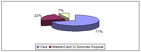 Соотношения по типам платежных систем в 2009 году составили: 71% Visa; 22% - MasterCard; 7% - «Золотая Корона» в 2009 году представлено на рис. 2.13.