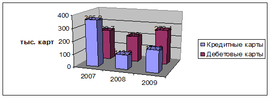 Соотношение дебетовых и кредитных карт за период 2007 – 2009 гг. существенно изменилось (табл. 2.12 и на рис. 2.14). Если в 2007 году основную долю составляли кредитные карты, то в 2008-2009 гг. упор сместился на дебетовые.