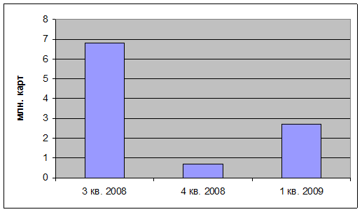 Рисунок 2.2 – Динамика выпуска пластиковых карт в России за период III кв. 2008 – I кв. 2009 года