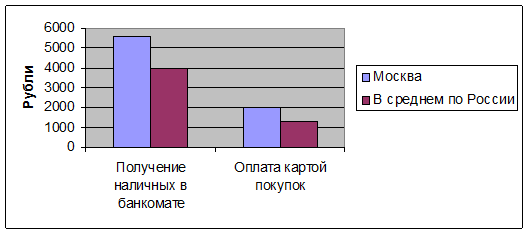 Согласно информации Банка России, в среднем по стране за одну транзакцию российский владелец пластиковой карточки получает в банкомате четыре тысячи рублей (в Москве — около 5,6 тыс. рублей). При оплате картой покупок в среднем по России за одну транзакцию списывается около 1,3 тыс. рублей (в Москве — около 2 тыс. рублей).