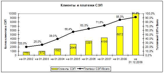 В настоящее время данная система является залогом успешной работы с юридическими лицами и проводит через себя в электронном виде более 90% всех платежных инструкций банка, более 60% из которых обрабатываются без участия человека. Динамика роста клиентской базы и проводимых через систему платежей отображена на рисунке 3.1.