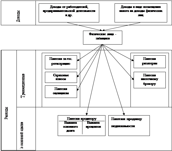 Из рис. 2 видим, что доходы заёмщиков не примечательны ни чем, кроме возможности возмещения налога на доходы физических лиц в виде имущественного вычета. Однако их расходы, имеют ряд характерных особенностей, свойственных исключительно данной группе населения. В частности, помимо расходов связанных непосредственно с покупкой недвижимости и обслуживанием ипотечного кредита, заёмщики несут ряд трансакционных издержек. В их число входят обязательные расходы, наличие которых обусловлено законодательно, и добровольные, связанные с привлечением экспертов по выбору объекта недвижимости и кредитной программы.