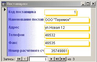| Код поставщика | Наименование поставщика | Адрес | Телефон | Факс | Номер расчётного счёта |