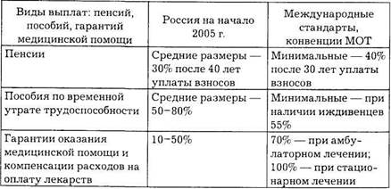 Что касается санаторно-курортного лечения за счет средств ФСС, то оно связано только с долечиванием по четырем видам заболеваний, а также после тяжелых травм и профзаболеваний. Если оценить существующий уровень социальной защиты, то можно констатировать, что сегодня он резко отстает от международных стандартов (табл. 2).