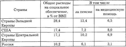Как следует из приведенных данных, к началу XX столетия в европейских странах расходы на социальное обеспечение достигли 25% ВВП, в США — 18%, в странах с переходной экономикой Центральной Европы — 17%, а в России — чуть более 10%. Следует особо подчеркнуть, что это расходы государства в целом на социальное обеспечение, куда входят наряду с расходами на социальное страхование и социальные расходы-пособия по безработице, социальные пенсии и др. Что же касается собственно доли затрат на социальное страхование в ВВП, то она колеблется на уровне 7-8%.