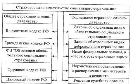В современной России действующая система страховой формы социальной защиты населения опирается на довольнообширную законодательную базу. Она включает в себя: во-первых, законодательные акты общего страхового законодательства, отдельные положения которого прямо или косвенно регулирует ОСС; во-вторых, законы, регулирующие отдельные его направления; в-третьих, правовые акты субъектов Российской Федерации, а также различные подзаконные акты — постановления Правительства РФ, приказы, инструкции министерств и ведомств, внебюджетных фондов ОСС; в-четвертых, сравнительно небольшую часть норм ОСС составляют решения судов и в первую очередь Конституционного Суда Российской Федерации. Его решения выполняют функцию "негативного" законодателя. Это означает, что он не принимает новых законов, а отменяет действующие, если они противоречат Конституции Российской Федерации.