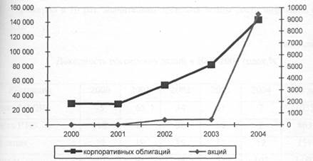 Объем размещения акций на внутренних рынках с привлечением нового капитала вырос в 2004 году более чем в 20 раз по сравнению с 2003 годом. Сравнение динамики размещения акций и корпоративных облигаций на внутреннем рынке страны характеризуют данные рис. 1.