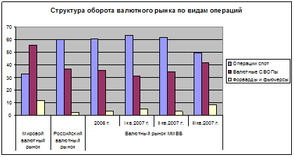 Мировой валютный рынок практически не имеет территориальных ограничений и операции со свободно-конвертируемыми валютами носят трансграничный характер. По данным BIS, в 2004 и 2007 гг. на рынке FOREX 38% объема торгов приходится на сделки между операторами внутреннего рынка, а 62% — на операции с зарубежными партнерами. В 2004 г. структура российского рынка была противоположной: 67% операций российские участники проводили между собой и только 33% составляли операции с нерезидентами. Процессы либерализации и снятие ограничений на движение капитала приблизили эту пропорцию к 50:50 (табл. 3).