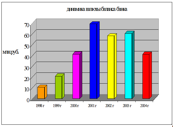 Анализируя динамики валюты баланса (рис.4) филиала коммерческого банка можно отметить, что максимальный объем валюты наблюдается в 2001году – 69,7 млн. рублей, темп роста к предыдущему году составляет 1,7 раза. В 2002 году мы видим снижение валюты баланса на 16,2%; в 2003 году – вновь небольшой подъем на 4,1%.