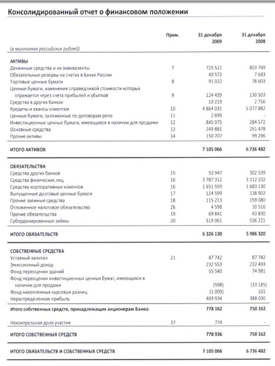 Для анализа пассивов Сбербанка России просмотрим консолидированный баланс банка за 2009 год.