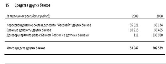 Срочные депозиты других банков представляют собой краткосрочные средства, полученные на межбанковском рынке. Сумма средств других банков в пассивах Сбербанка в 2009 году снизилась на 82,2%. А также удельный вес средств других банков в 2009 году составила 0,008% от суммы пассивов. Одной из причин уменьшения данного показателя является падение активности банков на межбанковском рынке России по причине мирового финансового кризиса, так как банки таким образом пытаются аккумулировать денежные средства с целью поддержания ликвидности и тем самым снижения рисков.