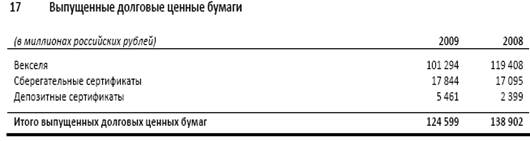 Причиной увеличения суммы сберегательных и депозитных сертификатов является увеличение количества депозитов вкладчиков. (примечание 16). Несмотря на это общая сумма выпущенных долговых ценных бумаг сократилась на 10,3 % в 2009 году. Причиной этому является снижение суммы векселей, что видно в таблице.